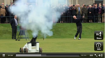 Mr Dawson teed off at precisely 8am in front of a large crowd of onlookers as a cannon fired alongside the tee. His drive went down the middle and finished around 40 yards short of the Swilcan Burn.