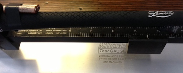 I have always been sensitive to changing swing weights on my clubs, which is one of the reasons I own an industry standard Mitchell Equipment swingweight scale (read review). So in order to test the effect that clipping an electronic device onto a club might have on swing weight, I took out a 5 iron, measured out 20 grams -- splitting the difference between ½ ounce and 1 ounce -- and attached it (in the form of two triple A batteries below the grip). Go figure, the swing weight changed from D2 to C9. A full 3 points.