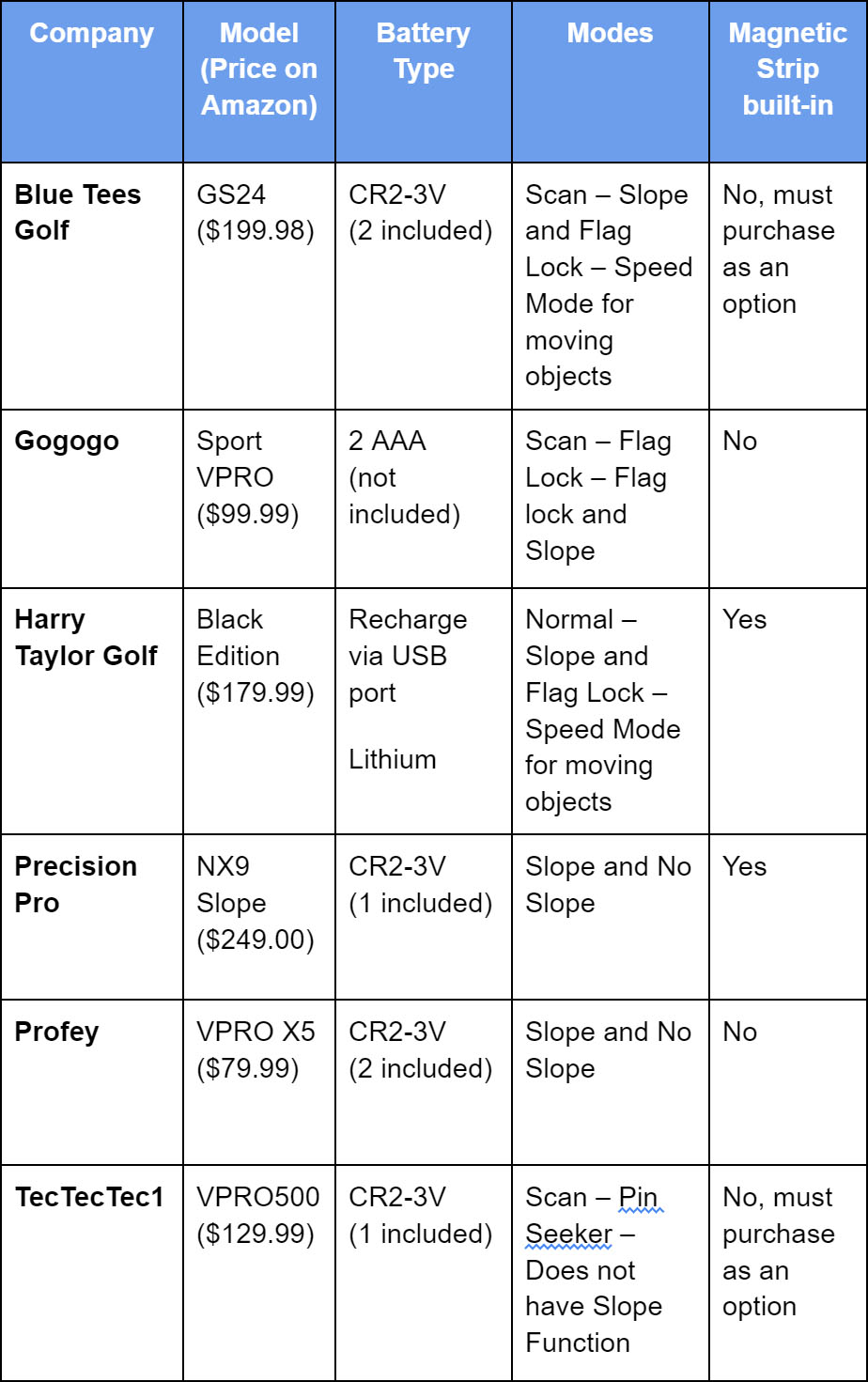 The six rangefinders we tested were: Blue Tees Golf (GS24), Gogogo (Sport VPRO), Harry Taylor Golf (Black Edition), Precision Pro (NX9 Slope), Profey (VPRO X5), and The TecTecTec1 (Vpro50).