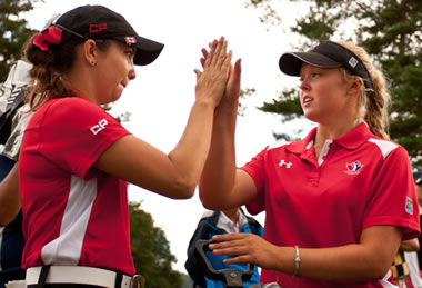KARUIZAWA, Japan (September 5, 2014)– Brooke Mackenzie Henderson (pictured, right) and Brittany Marchand combined for 9-under-par 135 in the third round as Canada held off defending champion Republic of Korea and maintained a two-stroke lead through 54 holes at the 2014 Women’s World Amateur Team Championship at Karuizawa 72 Golf East.