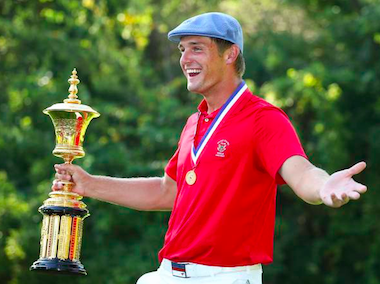 “Having my name etched on this trophy with the great Bob Jones as well as Jack Nicklaus, Tiger Woods, Phil Mickelson, all those guys, it's incredible,” said the 21-year-old from Clovis, Calif., who wears a Ben Hogan-style cap. “I can't even imagine what I just did. It won't sink in, I'm sure, for the next couple days. But I'm honored.”The 2015 United States Walker Cup Team member, who took individual honors at the Concession Club in Bradenton, Fla., in May for the NCAA title, joins Jack Nicklaus (1961), Phil Mickelson (1990), Tiger Woods (1996) and Ryan Moore (2004) in winning both championships in the same year.