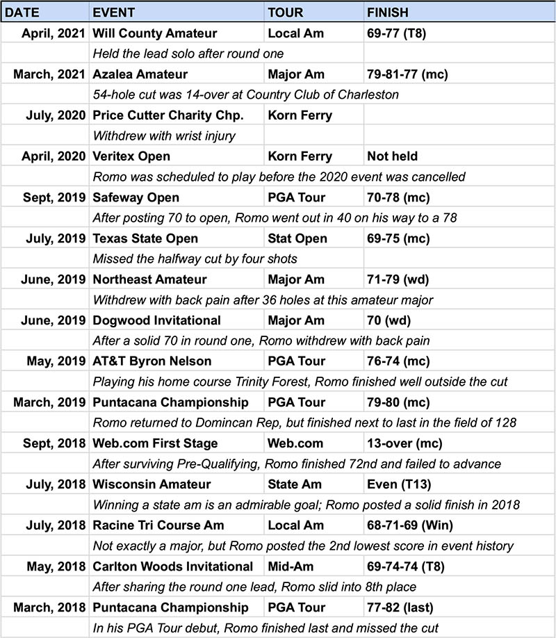 Here is a look at Tony Romo's recent performances in amateur and professional golf.