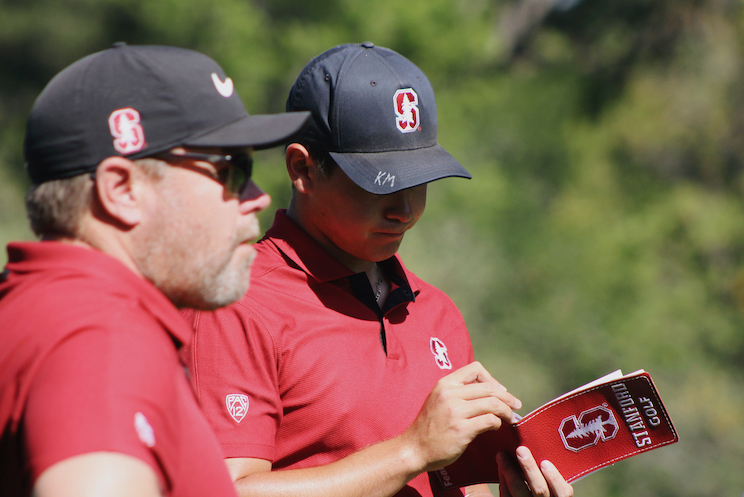 Stanford sophomore Karl Vilips studies notes with head coach Conrad Ray on the par-3 4th hole during the final round of the 2022 Goodwin Intercollegiate. (Conner Penfold/AmateurGolf.com)