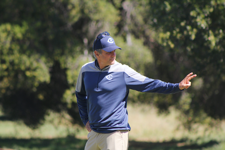 UC Davis head coach Cy Williams waves to a spectactor during the final round of the 2022 Goodwin Intercollegiate. (Conner Penfold/AmateurGolf.com)