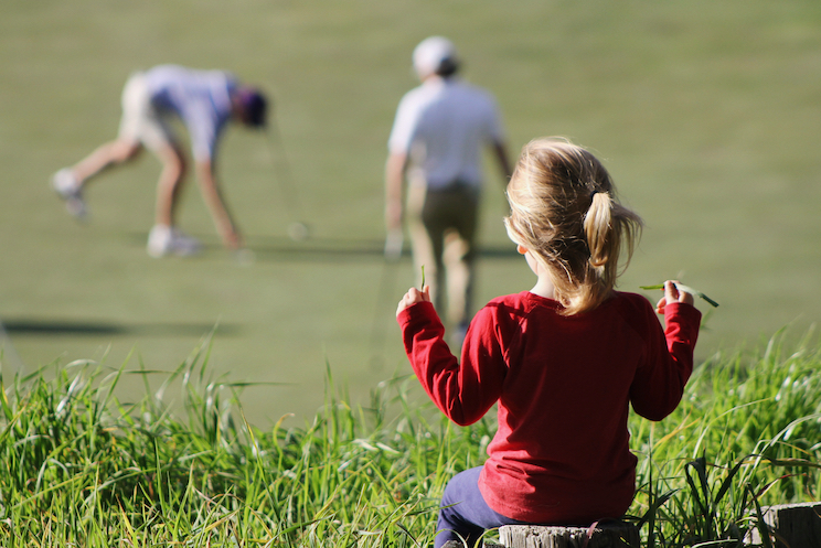 A young spectator watches as players hole out their putts on the par-3 14th hole during the final round of the 2022 Goodwin Intercollegiate. (Conner Penfold/AmateurGolf.com)