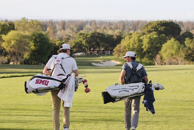 SMU junior Ollie Osborne and University of Nevada senior Quim Vidal Mora chat while walking down the 18th fairway during the final round of the 2022 Goodwin Intercollegiate. (Conner Penfold/AmateurGolf.com)