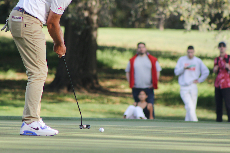 SMU freshman Justin Thompson rolls a birdie attempt at the par-4 15th during the final round of the 2022 Goodwin Intercollegiate. (Conner Penfold/AmateurGolf.com)