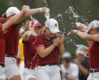After making a tap-in par on the final hole, her teammates drenched her in water, shouting, "Tilly, Tilly, Tilly." The celebration was shortlived, however, as the first-time winner will take an on-line midterm tonight and will be back in Columbia for another tomorrow morning.