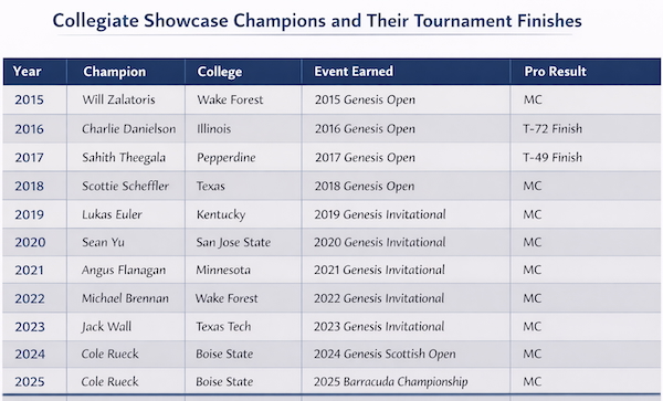 The Genesis Invitational Collegiate Showcase was founded in 2015. It is a chance for collegiate players to play with PGA Tour alumni from their respective schools. Two simultaneous competitions take place: In the individual competition, the collegiat...